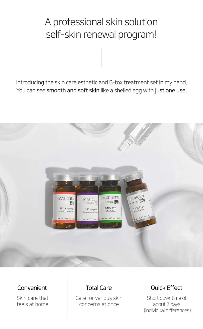 The Matrigen B-Tox Skin Renewal System, is also named the Algae Peel or Invisible Needle Peel. By using Biological Technology, scientists use the natural ingredient and extract into Silitox Needles (Needle Sponge Extract).- A very tiny micro needles size within um. After massage B-Tox peel on the face, Silitox needles will infuse into the skin layer to stimulate and regenerate the skin.