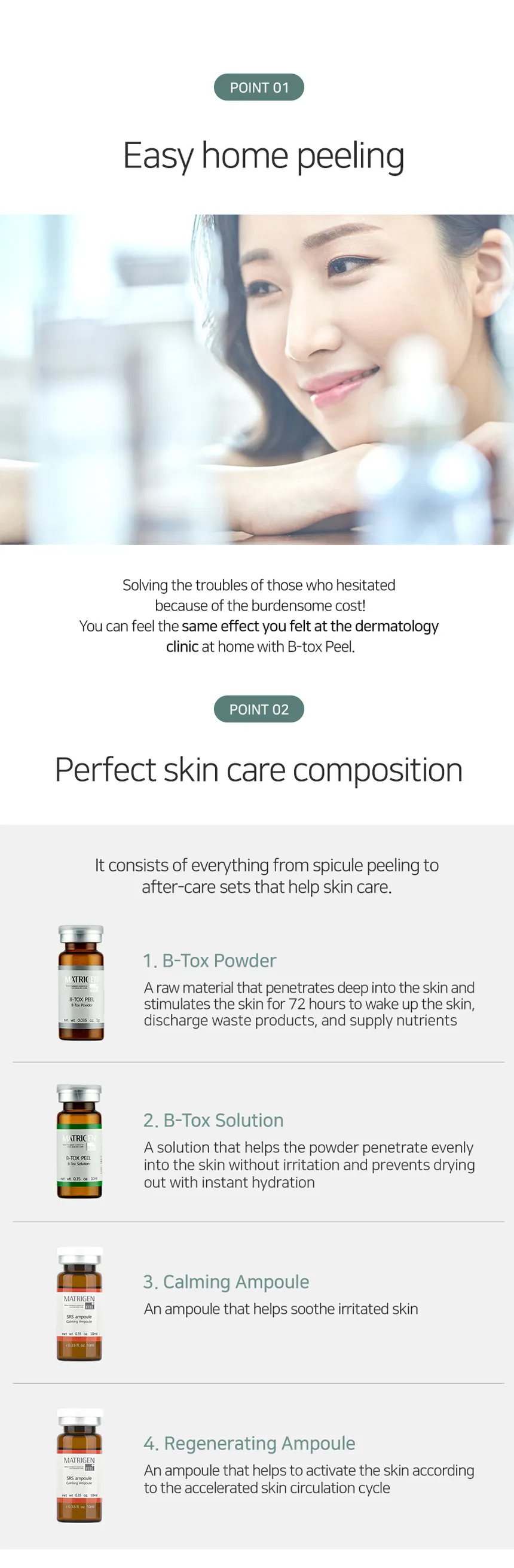 - B-Tox Calming Ampoule (10ml x 2) – Peeling calming & moisturization ampoule: It applied for the calming after peeling Sili-tox penetrates to calm down redden face while fully preventing the dryness with the top class moisture inducer, urea.