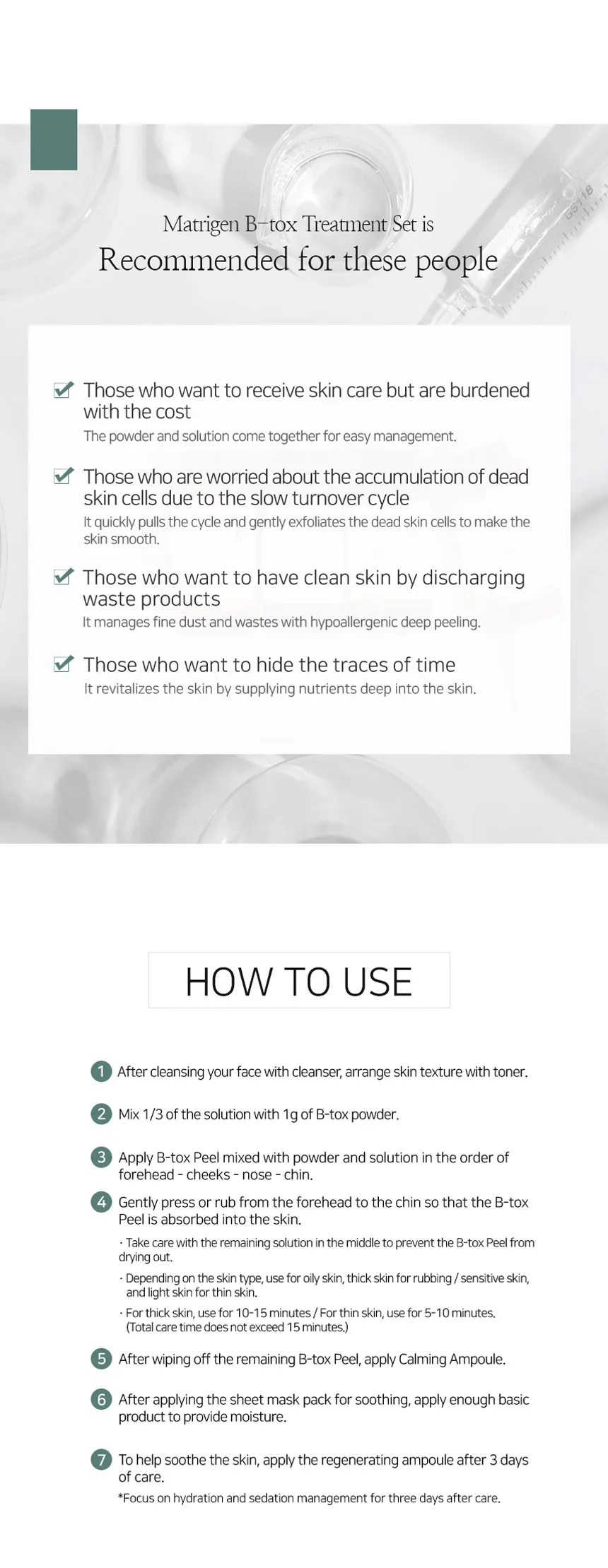 - B-Tox Solution (8ml x 2)- Solution to be mixed with peeling powder : Sili-tox penetrates deep into skin to maximize the effect, and it is necessary to mix with the Sili-tox powder to mitigate the skin stimulation and helps to established inside the skin.